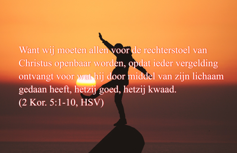 Want wij moeten allen voor de rechterstoel van Christus openbaar worden, opdat ieder vergelding ontvangt voor wat hij door middel van zijn lichaam gedaan heeft, hetzij goed, hetzij kwaad. (2 Kor. 5:1-10, HSV)