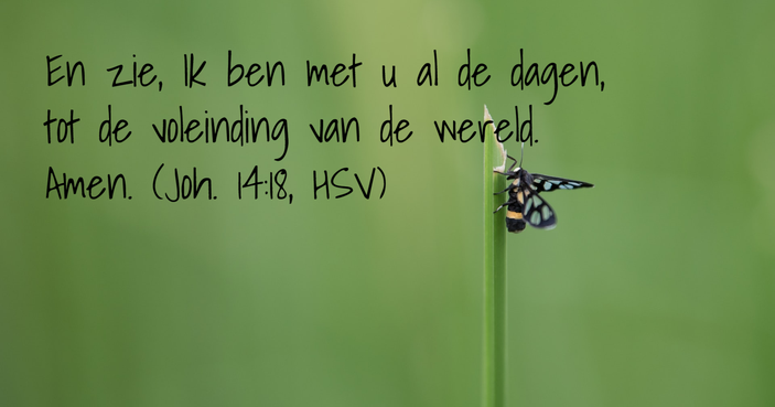 Soms voel ik me op eenzame paden tijdens mijn wandelingen in de natuur weleens alleen. Dan denk ik stel je voor dat ik een onbetrouwbaar figuur tegenkom. Ik neem me dan voor om op zo'n moment mijn zogenaamde hond te roepen of om te zeggen dat ik niet alleen ben. Dit laatste klopt zeker. Ik ben niet alleen. Er zijn altijd engelen om mij heen. Herken je dat gevoel van eenzaamheid dat je kan bekruipen? Of je nu in de natuur loopt of thuis op de bank of in een stoel zit. Overal kun je je alleen voelen. Je kunt je zelfs eenzaam voelen als er mensen om je heen zijn. Toch mogen we ons vasthouden aan bovenstaande tekst waarin staat dat Jezus bij ons is tot aan de voleinding van deze wereld. Hij is dus altijd bij ons! Laten we dat gevoel van eenzaamheid dus maar gauw loslaten. Ik sta op dit moment aan het begin van een zoektocht in de bijbel naar meer teksten die ons mogen bemoedigen als we ons alleen voelen. Wandel je mee?